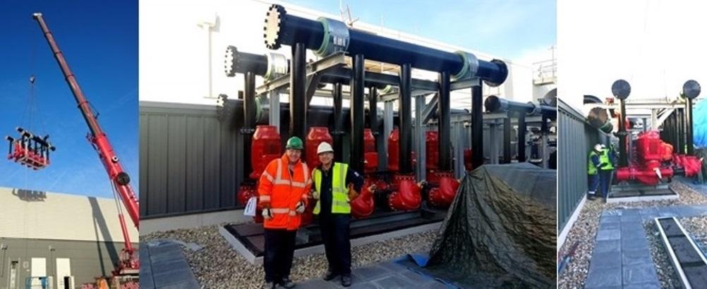 Glycol pump package being positioned and installed by Stonegrove. The pack consists of 5 off cold glycol pumps manufactured by Armstrong Fluids, each 354,000kg/h mono propylene glycol on at -3C off at -6C head 3.5bar, inlet and outlet connection each pump 200nb. Motor each 55kw inverter driven.Headers are carbon steel 16" (400mm) nb. Weight each pump 1.2 tons. Approximate overall package weight = 10 tons. Smiling crane driver Ian (green hat) and banksman Jim, are shown inspecting their fine precision work. Well done guys!
